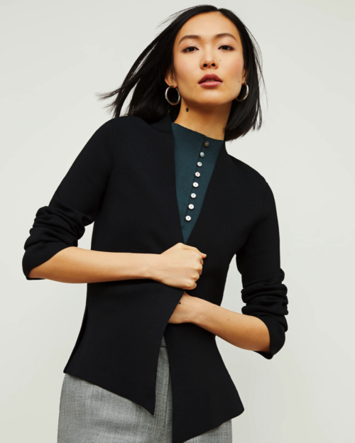 My issue with thin cardigans is that they don’t provide a lot of structure. ?And something with a little more weight will look a bit more professional, functioning more like a jacket.