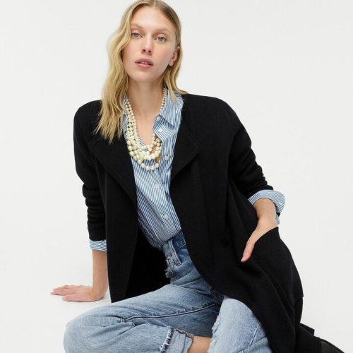 I’ve mentioned before that I love my Juliette Sweater Blazer. ?It’s a good mid-weight, looks very professional, and wears like iron. ?It comes in three neutral colors, runs into plus-sizes, and is great for work. ?If you’re on the petite side, J.Crew Factory has a similar sweater jacket that isn’t quite as long.