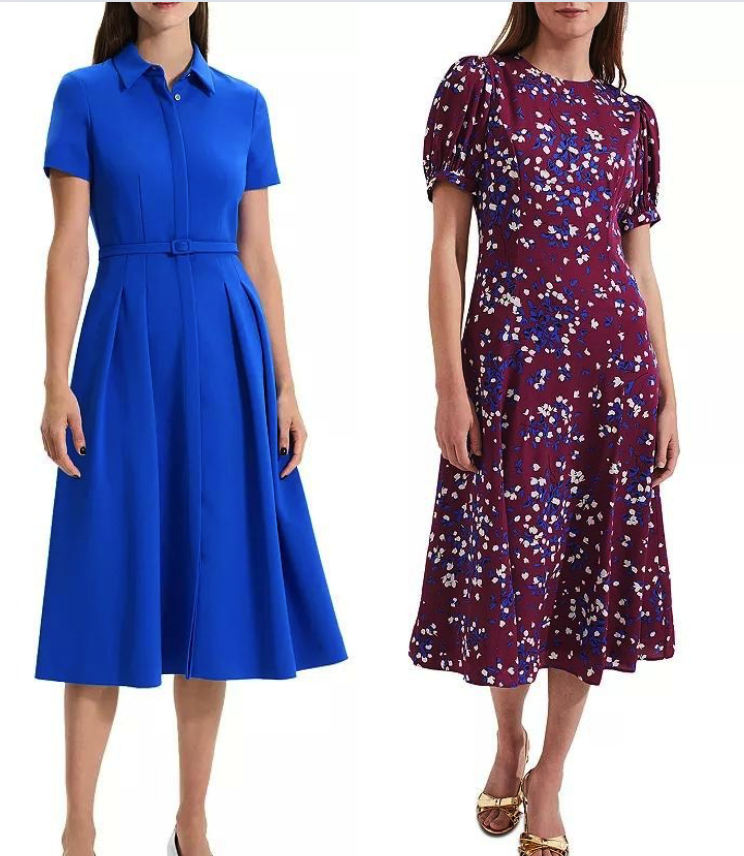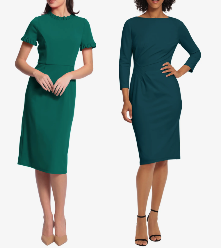 Maggy London is a great mid-price brand. ?I like the ruffle detail on the sheath on the left. ?It’s a nice accent on an otherwise simple dress. ?This option comes in five colors, all of them perfect for summer. ?Also, the deep teal dress on the right is really beautiful in person. ?The side pleating is nice for enhancing the look of your waist.