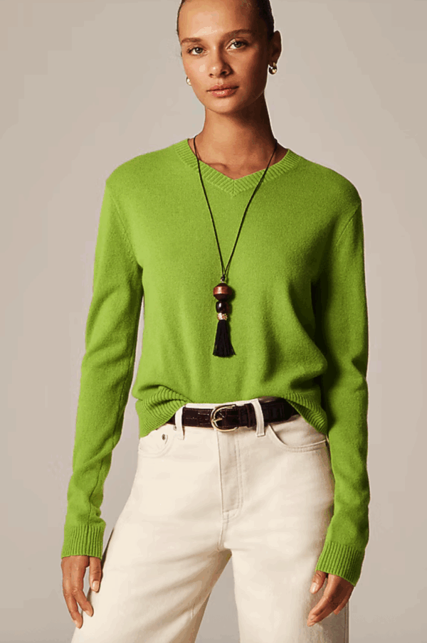 The green in this J.Crew sweater picks up the green in the blouse. ?Just make sure to foldover the sleeve and cuff so that you get a bit of the pattern peeking out at the wrists. ?It balances out the floral pattern at the collar.