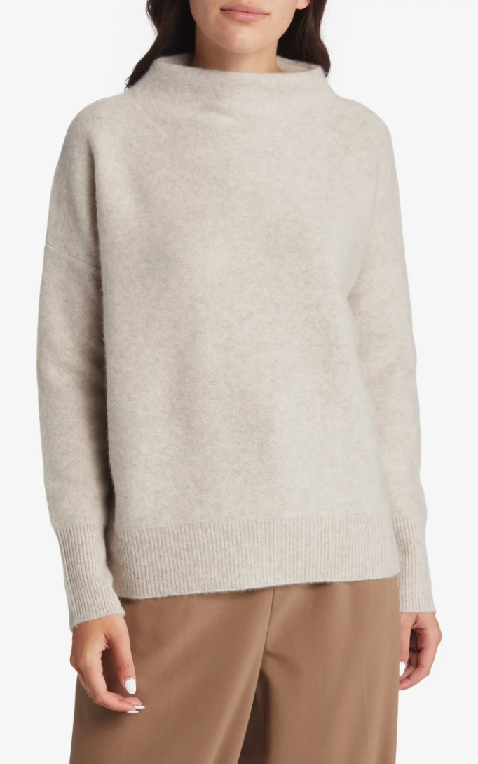 If you’re looking for an elegant, feminine sweater for family gatherings and holiday parties, a relaxed funnel neck is the right choice. It looks great with jeans, with wide leg trousers, with silk pants. Here are a few choices in different price points.