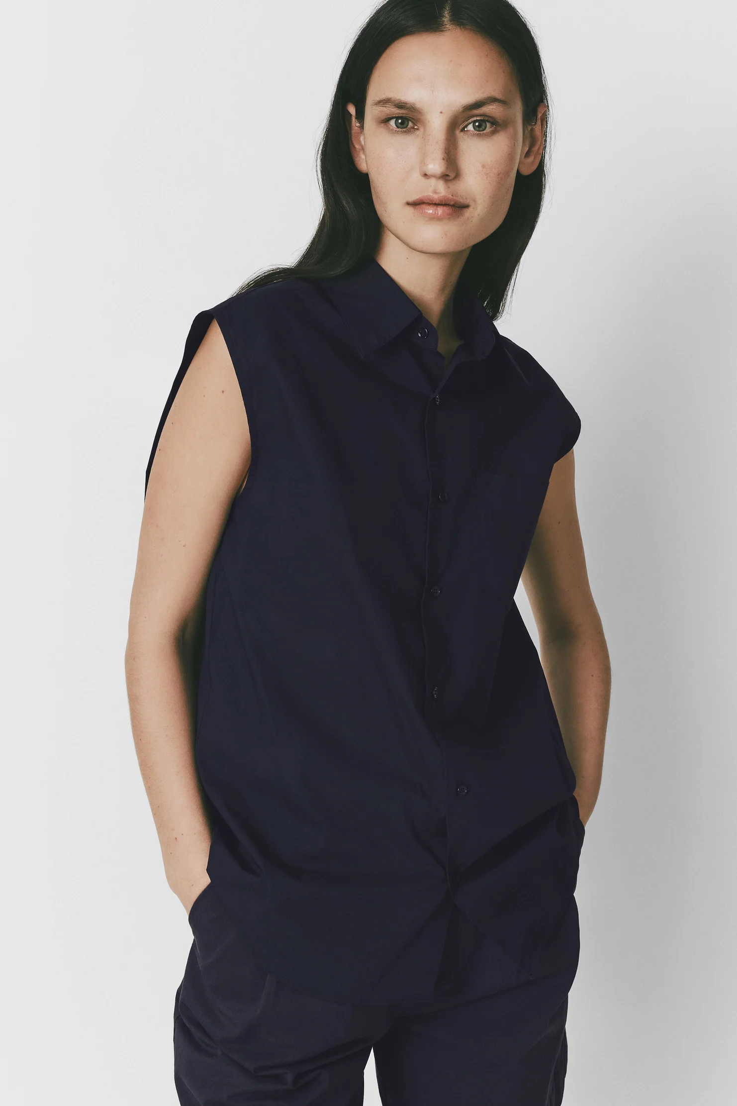 I love a cap sleeve shirt in the summer, a little breezier than short sleeves, but not a tank top. This navy Button Up Shirt would look great with navy pants for work or with white shorts for weekend.