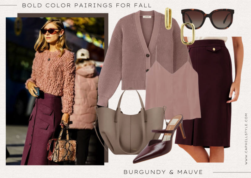 Burgundy and mauve is a softer palette that is bold but approachable. ?This cardigan and cami combination from Everlane pairs well with the burgundy hues. ?I chose this pencil skirt from Talbot’s because I liked the gold details. ?For something simpler, this Preston & York pencil skirt is a great option.
