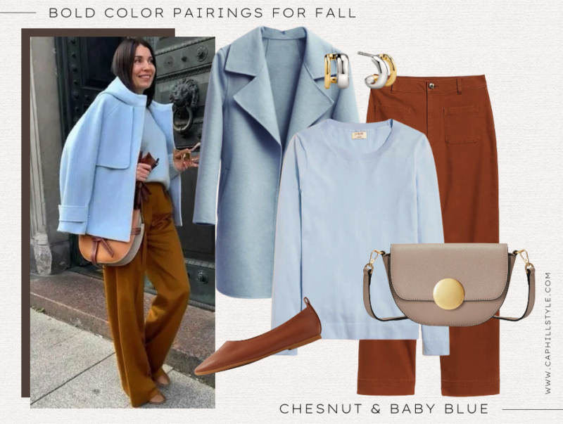 The next combination is baby blue and chestnut. ?Mixing the cool blue with the warmer undertones of the chestnut creates an interesting contrast. ?These cropped pants from Old Navy are fantastic, but if you want something full length, these Madewell pants (in petite and plus) are a great option. ?The coat and sweater bring in that pale, icy blue. ?Another option would be a light chambray shirt like this J.Crew chambray shirt or this banded denim shirt from Banana Republic.