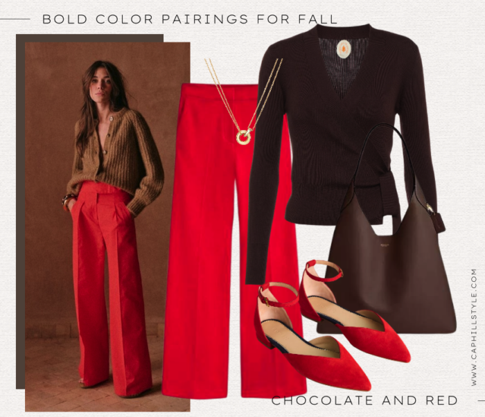 Finally, there is a richness to mixing red and chocolate. ?For this outfit, I pulled a sleek wrap sweater and paired it with a wide leg pant to balance the look. ?I added a pointed toe flat to elongate the leg and continue the look.